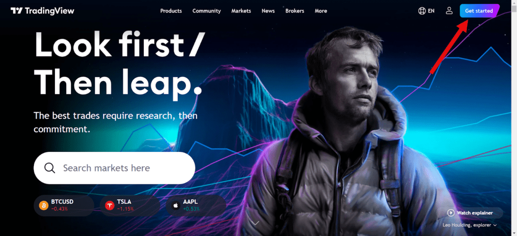 جهت ساخت حساب کاربری در تریدینگ ویو از صفحه اصلی به آدرس tradingview.com وارد شده و روی دکمه Get started کلیک کنید.