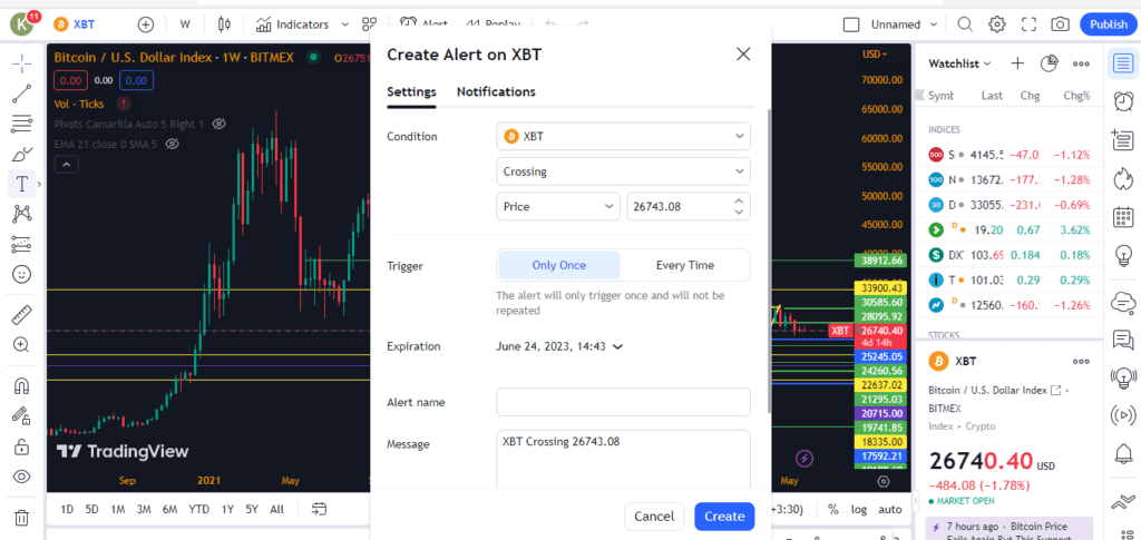 در بخش بعدی با Create alert برخورد میکنیم که عملکرد آن ایجاد زنگ هشدار بر اساس تغییرات قیمتی نمودار است. کاربر با فعالسازی این قسمت میتواند از ریزش یا رشد ناگهانی بازار جا نماند و API هوشمند تریدینگ ویو کاربر را از این تغییرات باخبر میکند.