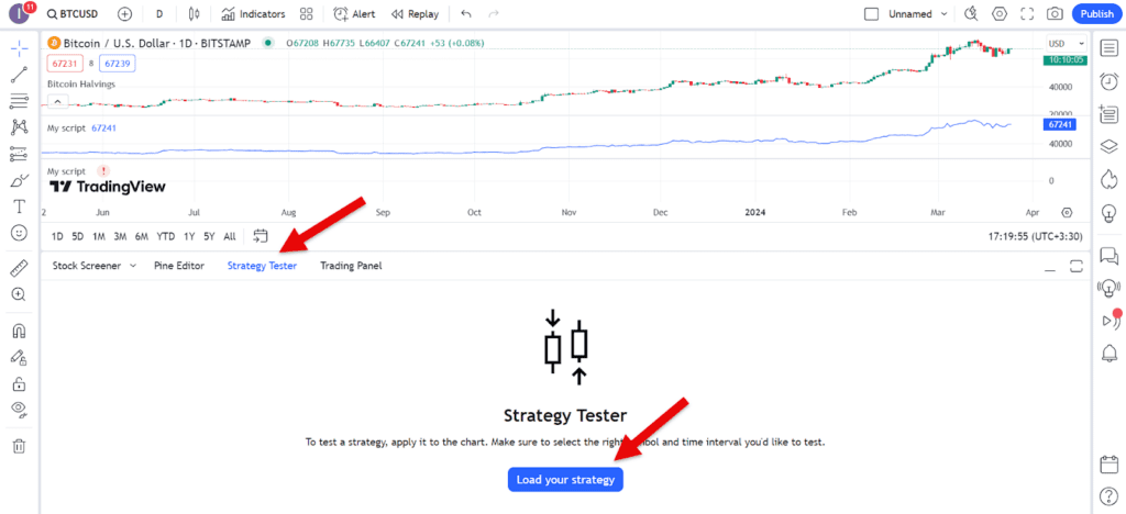 گرفتن بک تست یا آزمایش استراتژیهای معاملاتی در تریدینگ ویو از طریق بخش Strategy Tester در نوار پایین نمودار انجام میشود. با مراجعه به این بخش و کلیک روی گزینه Load your strategy میتواند عملکرد اندیکاتورها و استراتژیهای آماده یا اختصاصی خود در گذشته را آزمایش کرده یا اصطلاحاً از آنها بک تست بگیرید.