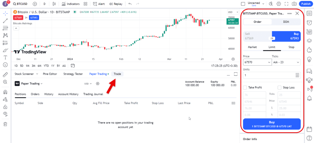 با اضافهشدن گزینه Trade به پایین نمودار، حالا قادر خواهید بود جهت یادگیری تحلیل بازار، معاملات آزمایشی انجام داده و استراتژیهای خود را شبیهسازی کنید.