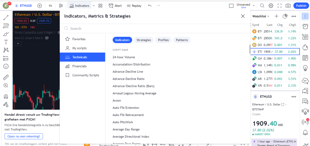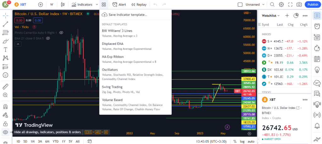 در قسمت بعدی میتوان اندیکاتورها، معیارها، استراتژیها و پروفایلهای مختلف را انتخاب و بر روی صفحه اصلی مشاهده کرد. نکته جالب اینجاست که اگر کاربر اسکریپت مخصوص خود را توسعه داده و ذخیره کرده باشد در بخش Myscripts قابل دسترس است و همینطور اسکریپتهایی که توسط کاربران برای عموم به اشتراک گذاشته شدهاند، قابل جست و جو و دسترسی است. در بخش اندیکاتورها (Indicators) شاخصهای محبوبی از جمله حجم معاملات (Volume)، بولینگر باند (Bolinger Band)، شاخص قدرت نسبی (RSI)، انواع میانگین متحرک (Moving Average) یا شاخص پارابولیک سار (Parabolic SAR) و دهها ابزار تحلیلی دیگر مشاهده میشود.