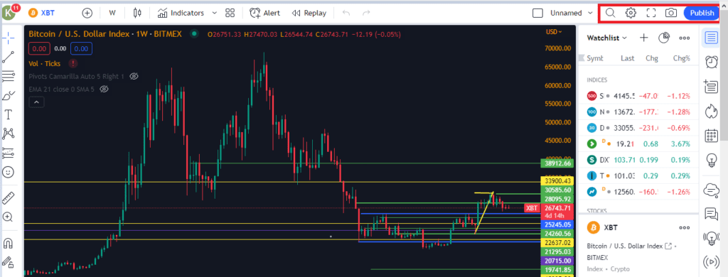 در بالا و در قسمت راست صفحه دکمههای کاربردی قرار دارد که به ترتیب بخش ذخیره نمودار، جستوجوی سریع، تنظیمات نمودار، حالت تمام صفحه (Fullscreen)، اسنپ شات یا گرفتن عکس از نمودار (با تصویر دوربین) و نهایتاً دکمه انتشار دیدگاه در مورد یک نمودار وجود دارد.