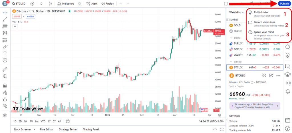 برای انتشار دیدگاه باید روی دکمه Publish در بالای صفحه، گوشه سمت راست کلیک کرد. با فشردن این دکمه، دیدگاه یا تحلیل شما نسبت به یک دارایی در بخش ایدهها یا Ideas این وبسایت منتشر میشود. ممکن است بر اساس نوع انتشار با بخشهایی به شکل فرم مواجه شوید که ابتدا باید قسمتهای درخواستشده را پر کنید. در بخش انتشار حتی امکان پخش زنده تحلیل و استریم نیز وجود دارد اما بخش Publish در تریدینگ ویو به سه حالت امکانپذیر است: