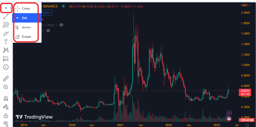 اولین دستهبندی در این نوار ابزار مربوط به چگونگی نمایش حالت ماوس بر روی نمودار است که میتواند به حالت نقطه، پیکان یا محل تقاطع باشد و همینطور یک پاک کن (Eraser) برای حذف سریع ترسیمها در انتها این بخش در نظر گرفته شده است که در تصویر محل آن دقیقتر به نمایش درآمده است. در حالت معمول این قسمت به صورت Cross در چارت به نمایش در میآید.