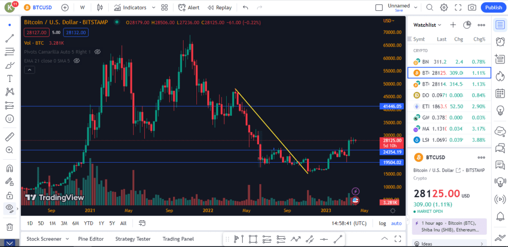برای نمونه در تصویر زیر با استفاده از ابزار خط روند (Trend Line) دو نقطه بر روی نمودار قیمت ارز بیت کوین به یکدیگر متصل شدهاند و خط زرد نمایان گر این ترسیم است. همچنین چند خط حمایت و مقاومت نیز به طور فرضی با رنگ آبی به نمایش درآمدهاند.