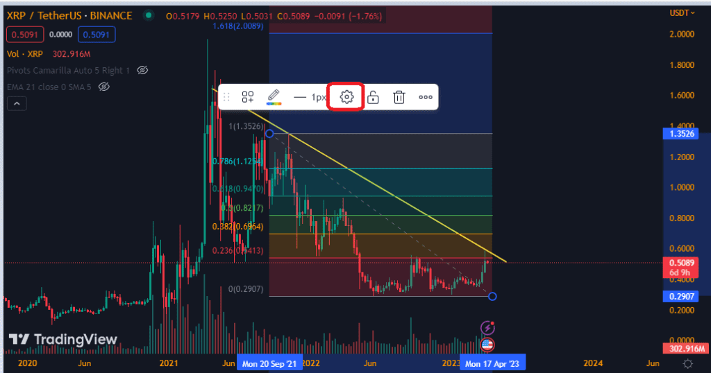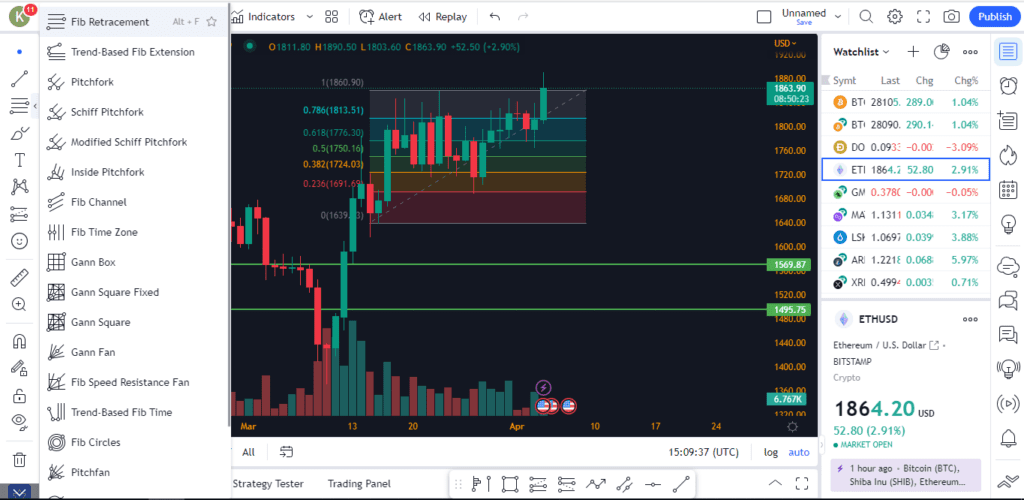 در دستهبندی سوم از این نوار ابزار، انواع خطوط اصلاح فیبوناچی و انواع چنگالها و خطوط گن (Gann) و… در دسترس قرار گرفته است که در حالت تنظیمات معمول وبسایت، خروجی آنها به طور استاندارد و بر اساس فرمولهای ریاضی هرکدام است، اما تمامی دادهها در بخش تنظیمات قابل تغییر است. برای نمونه در تصویر زیر از خطوط اصلاحی فیبوناچی استفاده شده است و اعداد طلایی موجود در این ابزار خطوط حمایت و مقاومت را بر اساس فرمول این اندیکاتور ایجاد کرده است.