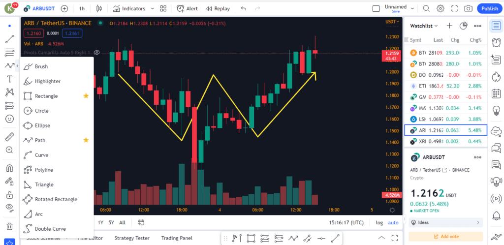 دستهبندی چهارم مربوط به قلم، برجستهسازی یا هایلایت، ایجاد باکس یا محفظه به شکل مربع یا مستطیل یا کشیدن مسیر به طور دستی است. به عنوان نمونه در تصویر زیر از ابزار مسیر یا Path برای حرکت قیمت آربیتروم (ARB) استفاده شده است.