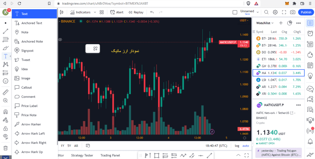 دسته بندی پنجم بخشی است که انواع روشها برای یادداشت یا اضافه کردن متن بر روی نمودار را در اختیار کاربر قرار میدهد. به عنوان نمونه با استفاده از ابزار Text متن نمودار ارز ماتیک یا پالیگان (MATIC) در تصویر پایین نوشته شده است.