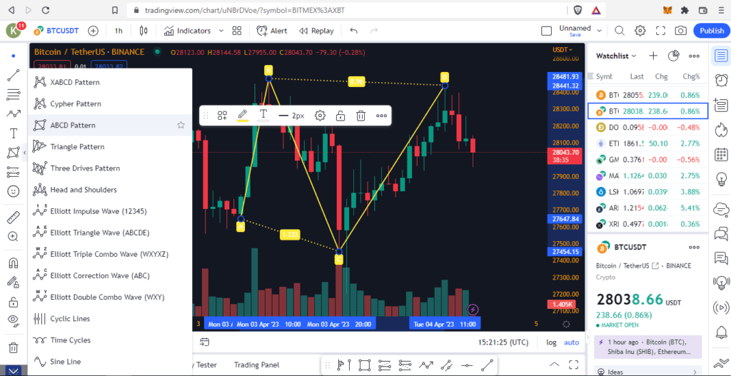 دستهبندی ششم مربوط به الگوهای پرتکرار است که در نمودارها و بر اساس تحلیل تکنیکال در گذشته رخ داده و باعث اتفاقاتی در بازار شدهاند. میتوان با انتخاب یکی از الگوها به بررسی تطابق آن با نوع شکلگیری کندلها در نمودار پرداخت. برای نمونه الگوی ABCD یا الگوی سر و شانه را در این بخش میتوان انتخاب و بر روی نمودار بیت کوین به تتر (USDT) رسم کرد. در تصویر زیر الگوی ABCD به طور فرضی ترسیم شده است.