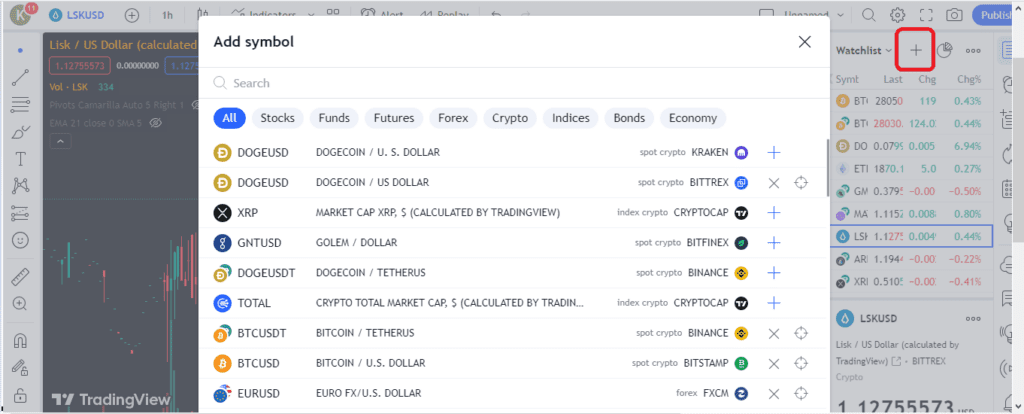 برای اضافه کردن هر نمادی کافی است بر روی دکمه + که در گوشه راست صفحه و در کنار واچ لیست Watchlist قرار دارد کلیک کنید تا به تفکیک نوع دارایی مورد نظر به نمایش در بیاید. همچنین با نوشتن نام دارایی مورد نظر به جستوجوی پرداخته، سپس بر روی گزینه + کلیک کنید تا ارز مورد نظر را به واچ لیست خود اضافه کنید. مزیت استفاده از واچ لیست قرار دادن داراییها در گوشهای از تصویر است که کاربر به طور متداول پیگیر آنها است.