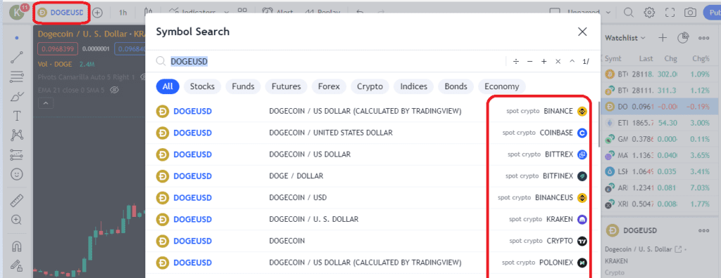 از سمت چپ به راست اولین گزینه اطلاعات حساب کاربر را به نمایش میگذارد. پس از آن نام نماد مربوطه در اختیار کاربر قرار میگیرد. در قسمت نام نماد یا (Symbol Search) میتوان نام کامل یا اختصاری هر دارایی را جست و جو کرد و یکی از گزینهها را انتخاب کرد. برای نمونه در تصویر زیر DOGEUSD جست و جو شده است و نتایج بر اساس اطلاعات صرافیهای مختلف که از بازار دوج کوین به دلار پشتیبانی میکنند، به نمایش درآمده است.