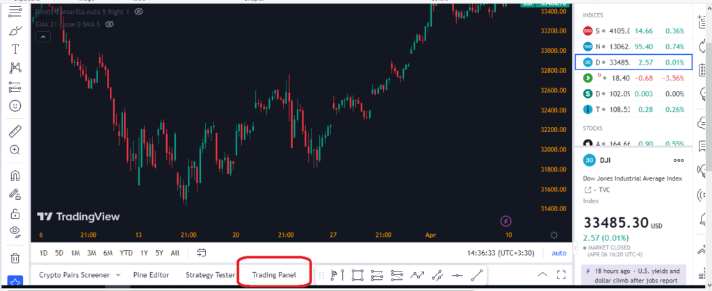 یکی از ویژگیهای جالب وبسایت Trading view امکان وصل شدن مستقیم به صرافیها و واسطههای بازار فارکس است. بنابراین کاربران میتوانند با استفاده از رابط کاربری و امکانات تمامعیار تریدینگ ویو معاملات خود را در صرافیهای ارز دیجیتال مانند بایننس انجام دهند. تنها کافی است که یک حساب در وبسایت تریدینگ ویو و یک حساب در صرافی ارز دیجیتال مورد نظر داشته باشید. برای مشاهده صرافی و بروکرهایی که در تریدینگ ویو برای انجام معاملات مستقیم پشتیبانی میشوند لازم است تا به صفحه نمودارها وارد شده و در پایین صفحه بر روی گزینه Trading panel کلیک کنید. در تصویر زیر این بخش مشخص شده است.