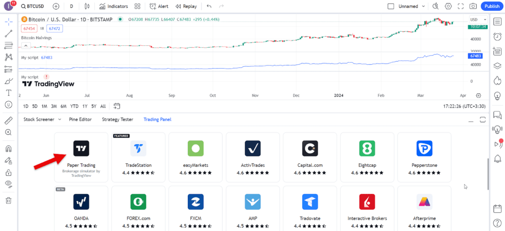 بین بروکرها یا صرافیهایی که امکان اتصال آنها به تریدینگ ویو از بخش Trading panel وجود دارد، گزینهای با نماد تریدینگ ویو و با نام Paper Trading وجود دارد که در واقع همان حساب معاملاتی دمو تریدینگ ویو است. با کلیک روی این گزینه یک حساب دمو با ۱۰۰٬۰۰۰ دلار موجودی فرضی در خود تریدینگ ویو برای شما ساخته خواهد شد.