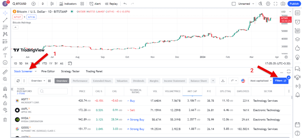 وبسایت Tradingview برای راحتی کار بخشی به نام Screener دارد که داراییها را بر اساس معیارهای مختلف، بازههای زمانی و شاخصهای تکنیکال فیلتر و به کاربر نمایش میدهد. در این قسمت میتوان به تنظیم هشدارها، ذخیره قالبها و انجام کارهای دیگر پرداخت. بخش screener در پایین صفحه اصلی تریدینگ ویو قابل دسترسی است و از سه بخش سهام، فارکس، جفت ارزهای دیجیتال و ارزهای کریپتویی تشکیل شده است.