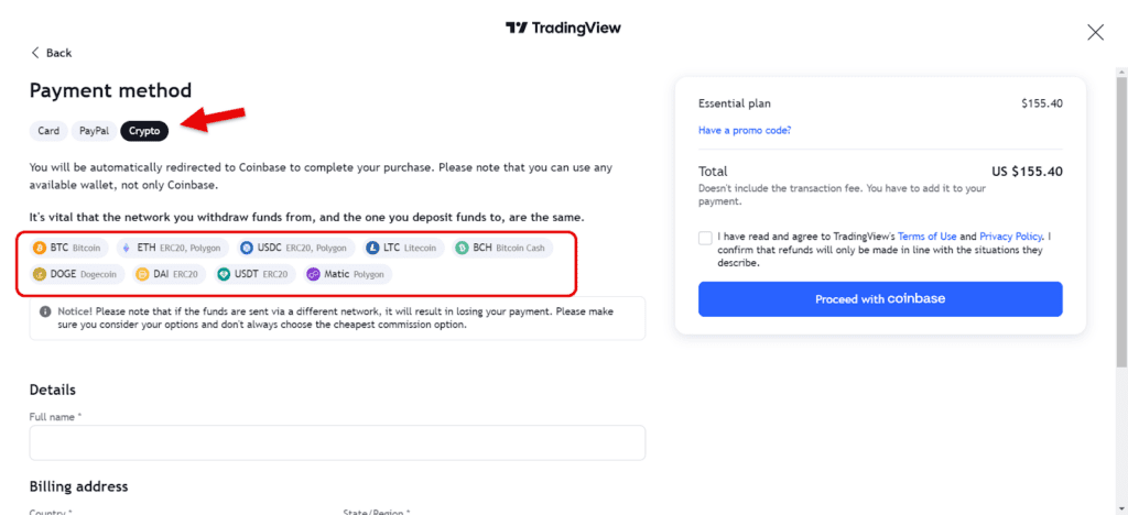 خرید تریدینگ ویو پریمیوم بهطور کلی با سه روش خرید مستقیم از طریق ویزا یا مسترکارت، خرید با ارز دیجیتال و خرید با کمک وبسایتهای واسطه ایرانی امکانپذیر است. برای کاربران ایرانی که ابزارهای پرداخت مستقیم دسترسی ندارند، خرید با ارز دیجیتال و خرید از وبسایتهای واسطه داخل کشور میتواند گزینه مناسبتری باشد. برای خرید با ارز دیجیتال کافی است هنگام پرداخت هزینه، گزینه Crypto را انتخاب کنید و مبلغ لازم را با ارز دیجیتال مورد نظر خود از بین گزینههایی مثل بیت کوین، اتریوم، تتر و دوج کوین پرداخت کنید. فقط توجه کنید که در روش پرداخت با ارز دیجیتال نمیتوان اشتراک ماهانه خریداری کرد و تنها امکان خرید اشتراک بهصورت سالانه وجود دارد.