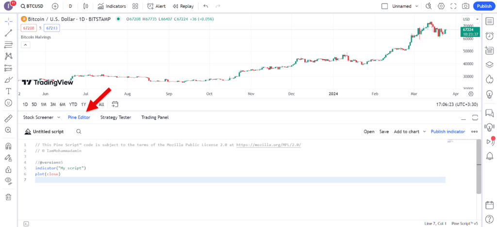 برنامهبنویسی، کدنویسی یا اسکریپتنویسی در تریدینگ ویو از نوار پایین نمودار و بخش Pine Editor در دسترس است. این بخش امکان ساخت اندیکاتورهای شخصیسازیشده را به کاربران میدهد. توسعهدهندگان علاقهمند به تحلیل تکنیکال میتوانند اسکریپتهای خود را در این بخش طراحی و بهصورت عمومی برای استفاده سایر کاربران منتشر کنند.