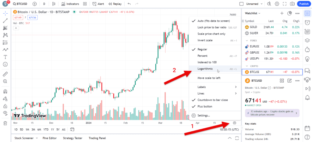 تنظیم نمایش نمودار به صورت خطی یا لگاریتمی در تریدینگ ویو