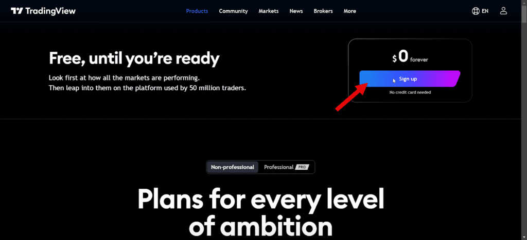 در ادامه پلنهای مختلف تریدینگ ویو به شما نمایش داده میشود، اما برای ساخت حساب و استفاده از امکانات سایت ملزم به خرید اشتراک نبوده و میتوانید بدون پرداخت هزینه، با کلیک روی دکمه Sign up حساب خود را تنها با واردکردن یک ایمیل، تنظیم رمز عبور و تأیید آدرس ایمیل، بسازید.