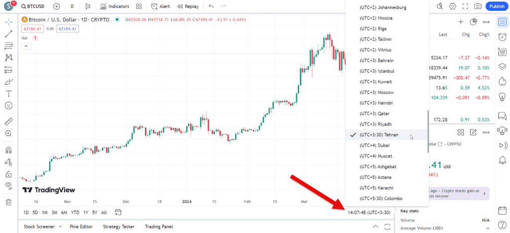 درست زیر تنظیمات نمایش لگاریتمی و خطی نمودار، دکمه تنظیمات ساعت و منطقه زمانی مشاهده میشود، با کلیک بر این قسمت اطلاعات مورد نیاز برای تنظیم این بخش در اختیار کاربر قرار میگیرد. برای تنظیم زمان نمودار به وقت تهران باید گزینه (UTC+3:30) یا همان Tehran را انتخاب کنید.