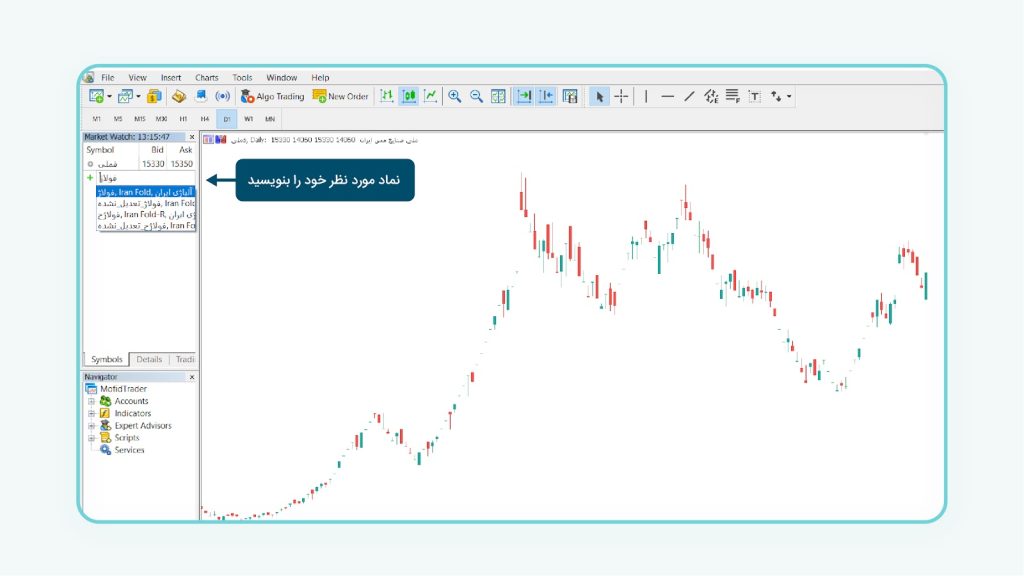 پس از نصب نرمافزار متاتریدر (MetaTrader)، میتوانید نماد مورد نظر خود را مطابق تصویر زیر جستجو کنید.