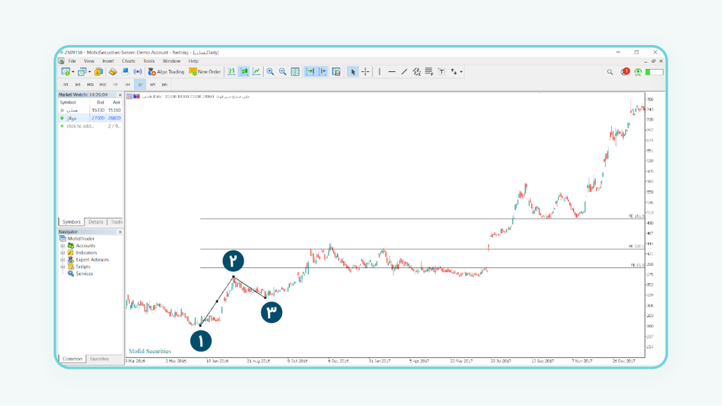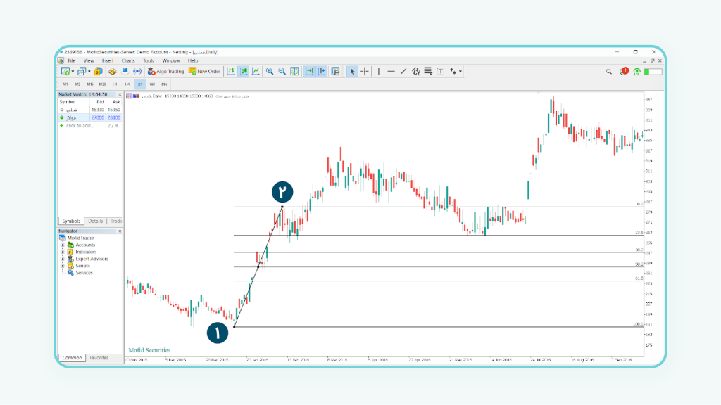 جهت استفاده از فیبوناچی خارجی در نرمافزار مفیدتریدر از همان ابزار فیبوناچی Retracement استفاده میشود. با این تفاوت که دقیقا برعکس حالت اصلاحی، ابتدا روی کندل انتهایی روندی که تشخیص دادیم کلیک کرده و نگه میداریم. سپس نشانگر ماوس را روی کندل ابتدایی روند قرار داده و آن رها کنید.