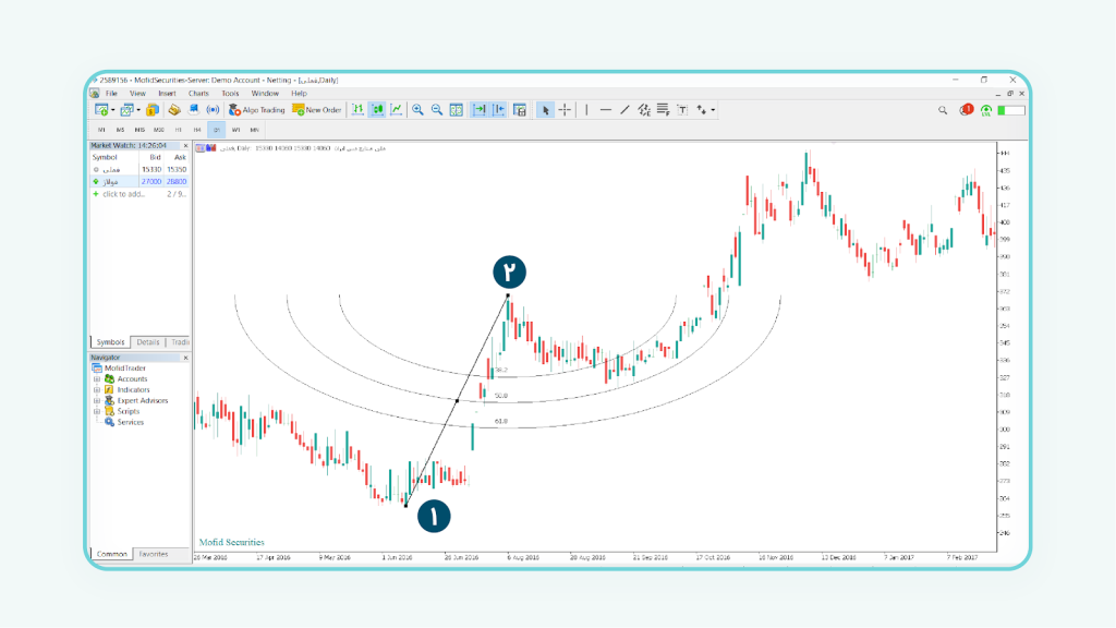 برای رسم این ابزار نیز به دو نقطه ابتدا و انتهای روند نیاز داریم. تنها کافیست با استفاده از ابزار فیبوناچی Arcs، این دو نقطه را به یکدیگر متصل کنیم. این ابزار، سطوح بازگشت یک روند را به صورت کمانهای موازی نمایش میدهد؛ به عبارتی میتوان گفت کمانها، نقاط برگشت قیمت را بر اساس صعودی یا نزولی بودن روند مشخص میکنند.