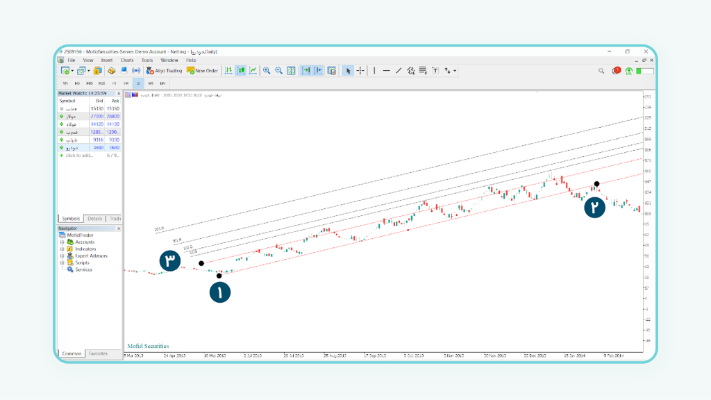 برای رسم این ابزار در مفیدتریدر کافی است «channel» را انتخاب کنید. سپس با استفاده از سه نقطهای که این ابزار در اختیارتان قرار میدهد، کف و سقف کانال قیمتی را مشخص کنید.