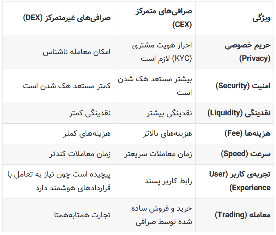 تفاوت اصلی بین صرافی های غیرمتمرکز (Decentralized Exchanges) و صرافیهای متمرکز (Centralized Exchanges) از نظر سرپرستی است. در اکثر صرافیهای متمرکز و معتبر، کاربران باید تایید هویت شوند و داراییهای دیجیتال خود را در کیف پولهایی که صرافیها تعیین کردهاند ذخیره کنند. هدف صرافیهای متمرکز راحتتر کردن معاملات بین کاربران، جلوگیری از کلاهبرداری و سو استفاده است. به همین دلیل بهطور کامل کنترل معاملات را در دست دارند. برای مثال شما میتوانید به راحتی در یک صرافی متمرکز و معتبر مانند نوبیتکس قیمت ارزهای دیجیتال را مشاهده کنید و در کمترین زمان اقدام به معامله نمایید. چنین ویژگی تنها با کنترل کامل معاملات امکانپذیر است. صرافیهای غیرمتمرکز هرگز داراییهای مشتری را نگه نمیدارند، در عوض همه تراکنشها توسط قراردادهای هوشمند غیرمتمرکز انجام میشوند. همچنین صرافیهای متمرکز سطح نقدینگی بالاتری را نسبت به صرافیهای متمرکز جذب میکنند. بهطور کلی صرافیها 100٪ بدون ریسک نیستند، با اینحال در صرافیهای غیرمتمرکز با انجام تراکنشها توسط قراردادهای هوشمند، امکان بروز آسیب از طرف هکرها وجود دارد.