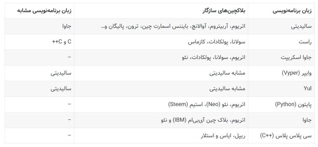 سالیدیتی (Solidity)، راست (Rust) و جاوا اسکریپت (JavaScript) سه مورد از محبوبترین زبانهای برنامهنویسی هستند که از آنها در توسعه قراردادهای هوشمند استفاده میشود. سایر زبانهای محبوب برای برنامهنویسی قراردادهای هوشمند و بلاکچینهای سازگار با آنها در جدول زیر معرفی شدهاند.