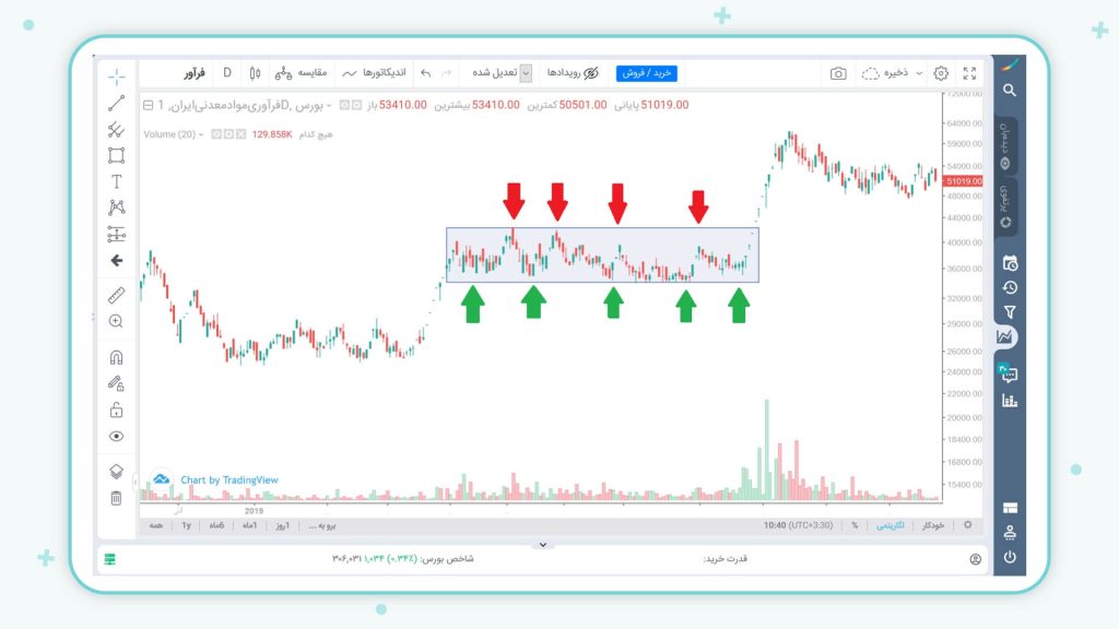با توجه به ذکر این نکته، زمانی که سهم از کانال به سمت بالا خارج شود، حرکت صعودی و هدف قیمتی آن بهاندازه عرض کانال خواهد بود و زمانی که سهم از کانال قیمت به سمت پایین خارج شود، هدف قیمتی به سمت پایین و بهاندازه عرض کانال است.