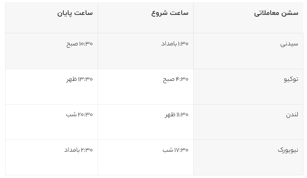 بازار فارکس یک بازار جهانی است که در طول هفته به صورت ۲۴ ساعته فعال است. این بازار را میتوان به چهار سشن معاملاتی اصلی تقسیم کرد: سیدنی، توکیو، لندن و نیویورک. هر سشن معاملاتی در زمانهای مختلف شروع و پایان مییابد و برخی از آنها با هم همپوشانی دارند. به وقت ایران، ساعت شروع کار بازار فارکس ۱:۳۰ بامداد روز دوشنبه و ساعت پایان کار آن ۱:۳۰ بامداد روز شنبه است. در جدول زیر میتوانید ساعت شروع و پایان هر سشن معاملاتی را به وقت ایران ببینید: